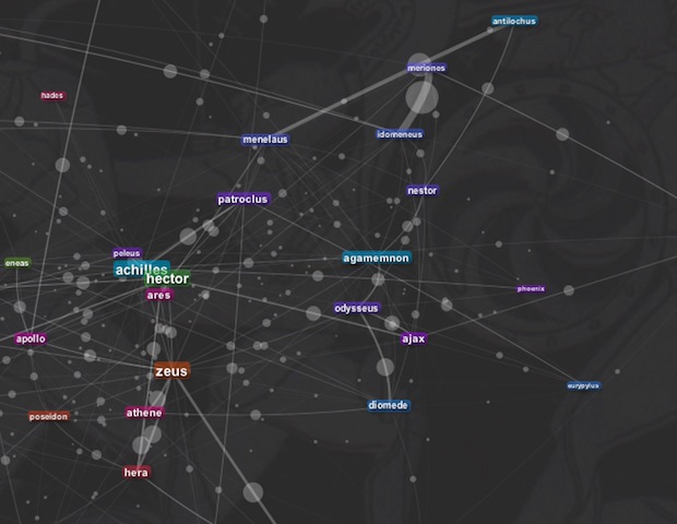 Découvrir un texte vieux de plus de 3 000 ans sous un angle totalement inédit, c’est le projet magique de Santiago Ortiz, disponible sur son site moebio.com. Il a créé deux datavizualisations interactives de l’Iliade : une version “stream” qui permet d’observer quels sont les personnages les plus présents dans les différents livres de l’oeuvre d’Homère et une version “network” pour visualiser les relations entre les personnages.